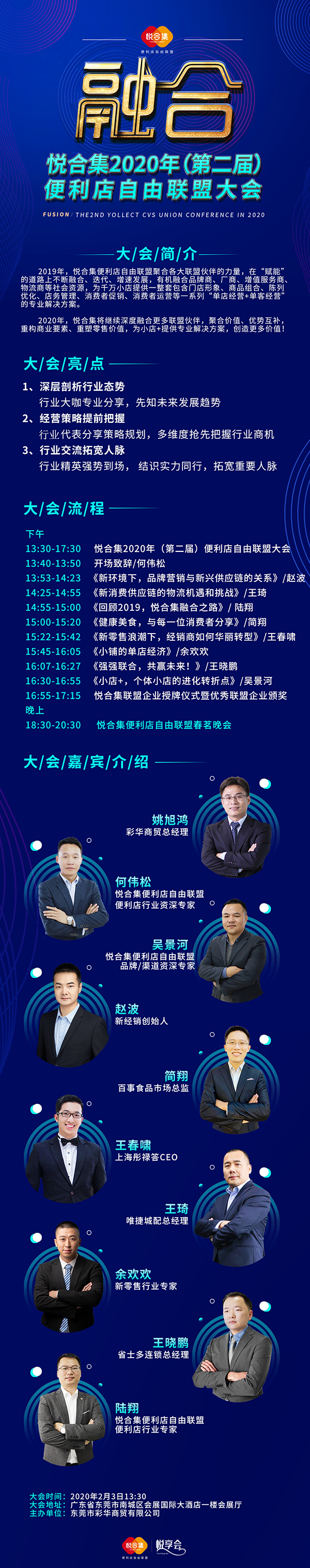 回顾2019年便利店行业,可以用“波澜壮阔”这个词来形容,虽然发展前景广阔,但是在发展过程中还是会面临着各种问题,如一些便利店连锁品牌企业想抢占更多市场空间,却面临渠道以及门店扩张成本高;渠道信息资源无法共享;供应链配送困难等问题。 为了更好应对2020年,助力联盟企业开拓更广阔市场领域,我们兹定于2020年2月3日(正月初十)在东莞国际会展大酒店举行主题为“融合”——第二届悦合集便利店自由联盟大会。 一、联盟大会参会嘉宾介绍 在本次采访中,王经理告诉我们:在与悦合集合作过程中,印象最深的有两点,第一是悦合集帮助省士多实现了全国配送能力;第二是悦合集为省士多提供了很多专业的门店经营知识与经营指导支持。在合作过程中,悦合集专业的售后服务让我们更加放心、省心、安心。 在新的一年里,王经理希望悦合集在未来规划中举行更多线上线下交流活动,可以与更多同行面对面交流与学习。