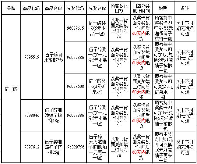 致尊敬的客户: 你好!现对伍子醉湘潭铺子槟榔的兑奖退货做如下更新说明: 一、兑奖明细: